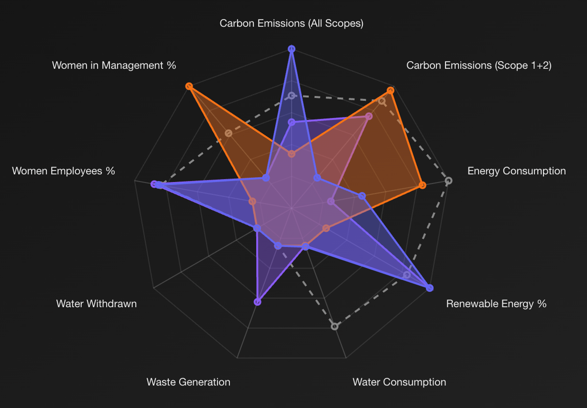 Compare your performance across multiple sustainability metrics simultaneously with interactive radar charts. See how you stack up against industry competitors in areas like carbon emissions, water use, waste management, and more